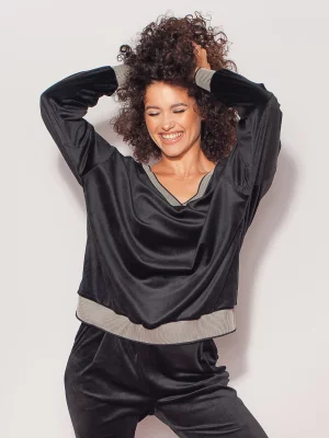 7. Czarna bluzka welurowa z kontrastami i kapturem