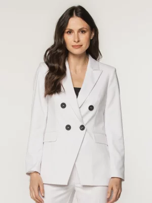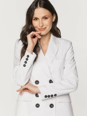 11. Biała marynarka damska z czarnymi guzikami