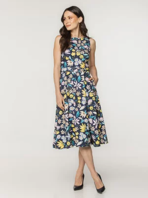 9. Granatowa sukienka z ozdobnymi rękawkami