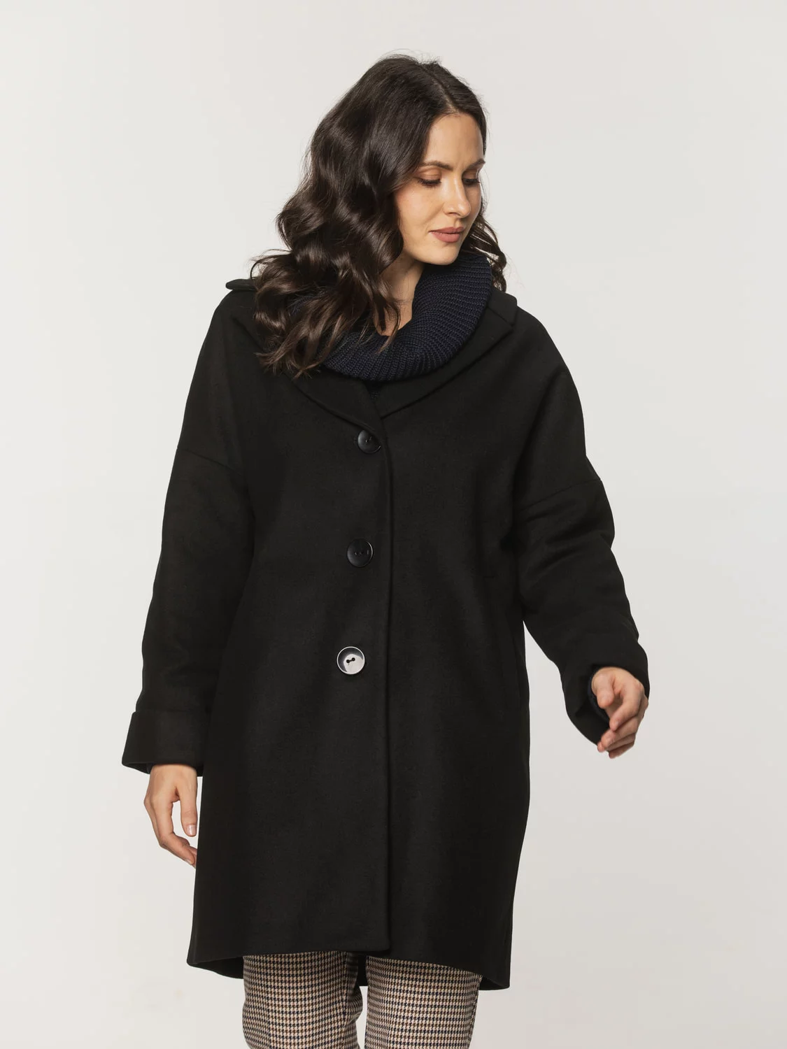 Przejściowy, prosty płaszcz damski ze stójką, o długości przed kolano. Zapinany na duże, czarne guziki. Minimalistyczny, casualowy fason sprawdzi się na wiele okazji, jak i na co dzień. Posiada 2 zewnętrzne, naszyte kieszenie.