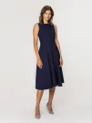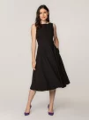 Rozkloszowana sukienka o długości midi, uszyta z pełnego koła, świetnie sprawdzi się zarówno do pracy, jak i na różnego rodzaju imprezy okolicznościowe. Szerokie ramiączka, zabudowane plecy i dekolt w kształcie łódki dodają sukience elegancji oraz klasy. Forma sukienki i pasek wiązany w talii doskonale modelują sylwetkę, nadając jej kształt klepsydry. Sukienka jest zapinana na zamek błyskawiczny umieszczony na plecach.